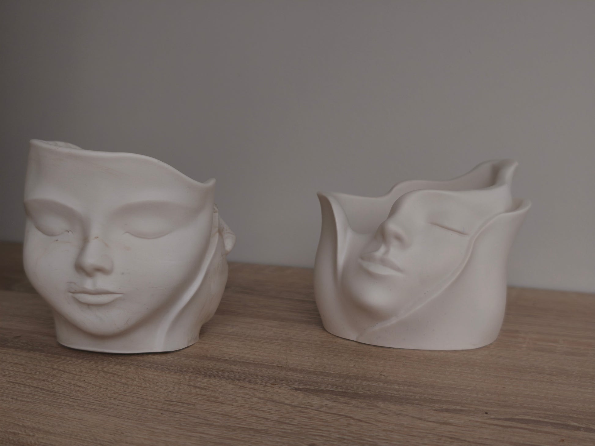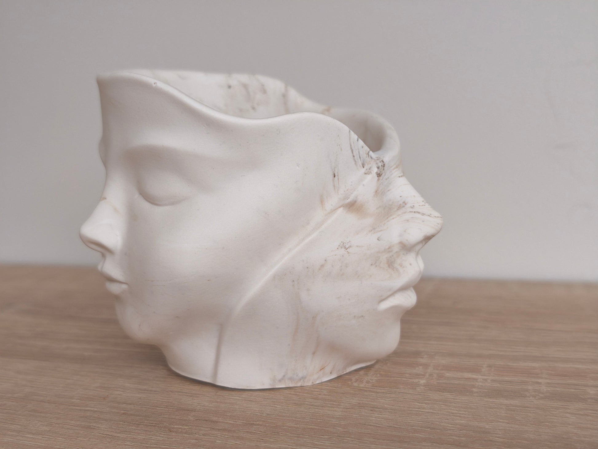 Contenant Double : Ce design met en avant deux visages dos à dos, créant une dynamique visuelle fascinante. Il peut servir de vase, de pot pour bougie, de rangement ou simplement comme objet d’art.