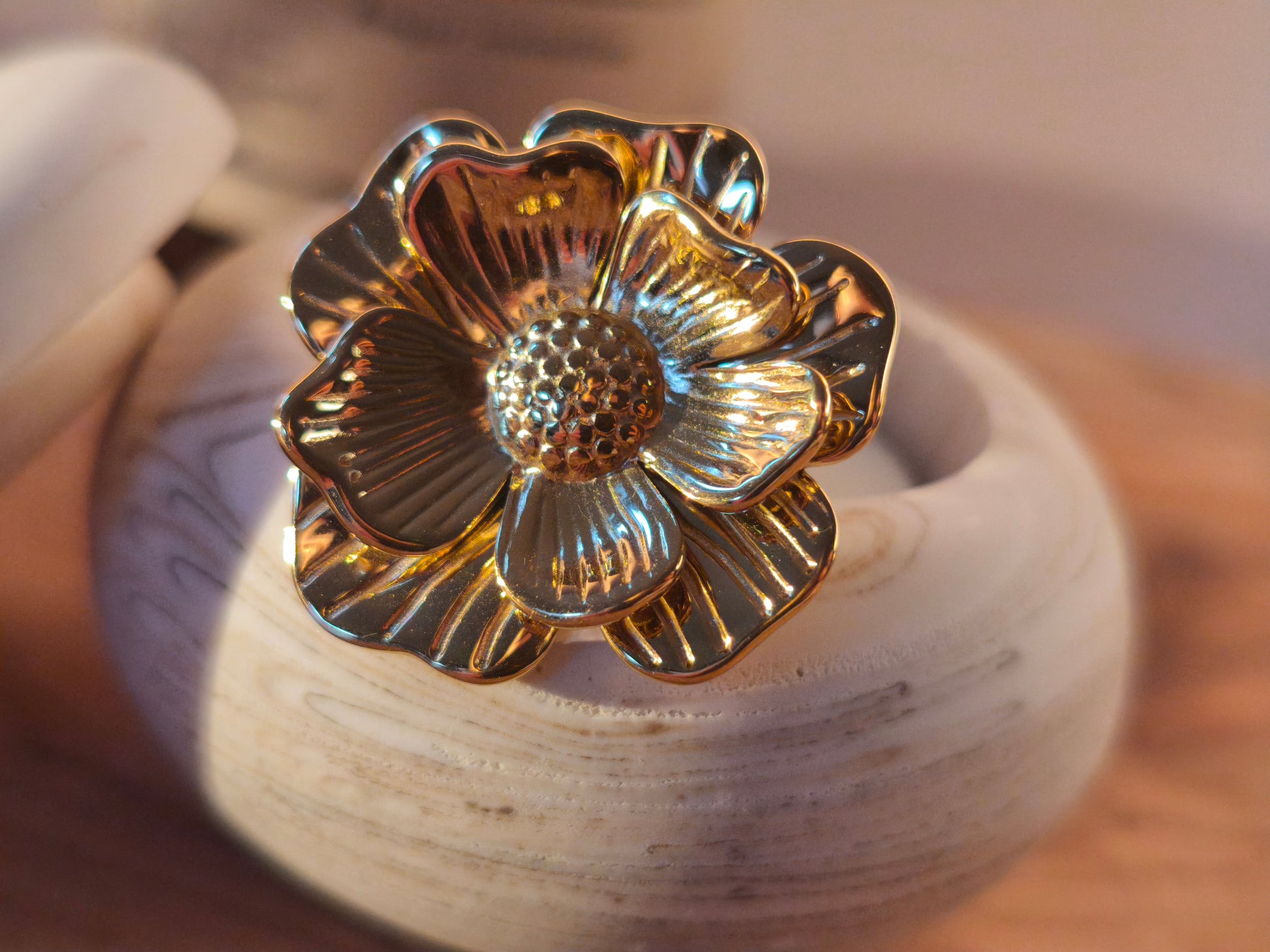Bague en acier inoxydable composée d'une fleur aux pétales texturées.