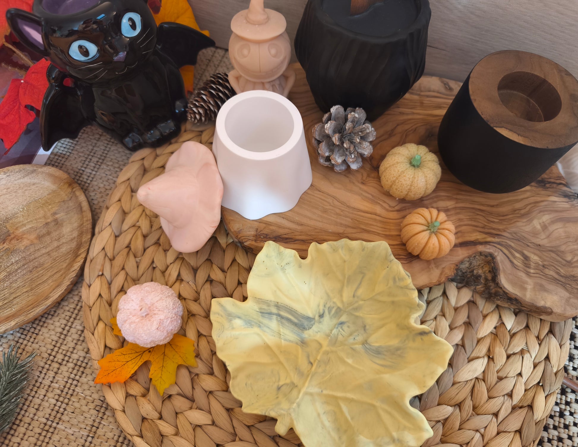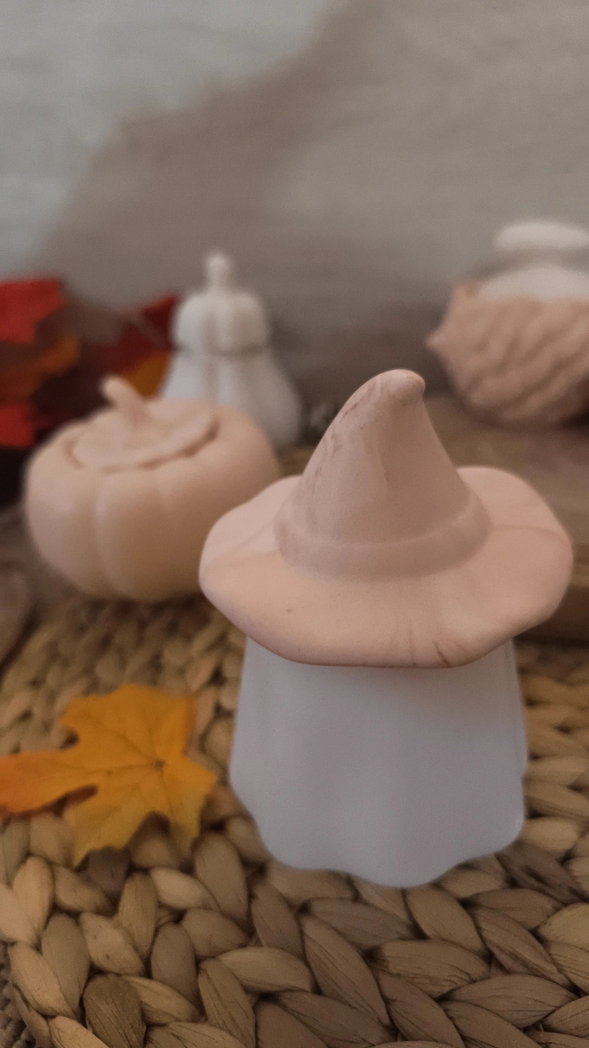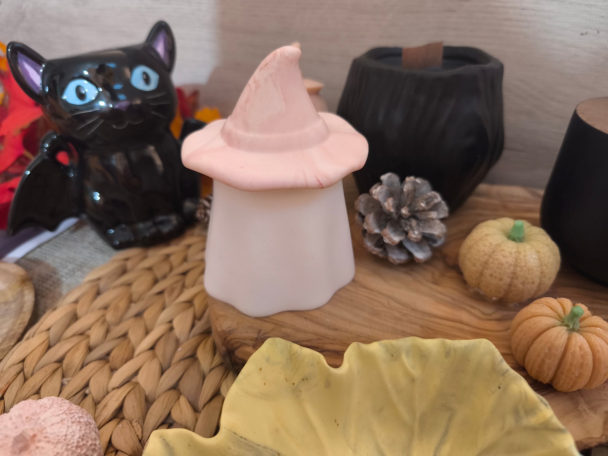 Pot représentant un chapeau de sorcière. Réalisé en Jesmonite.