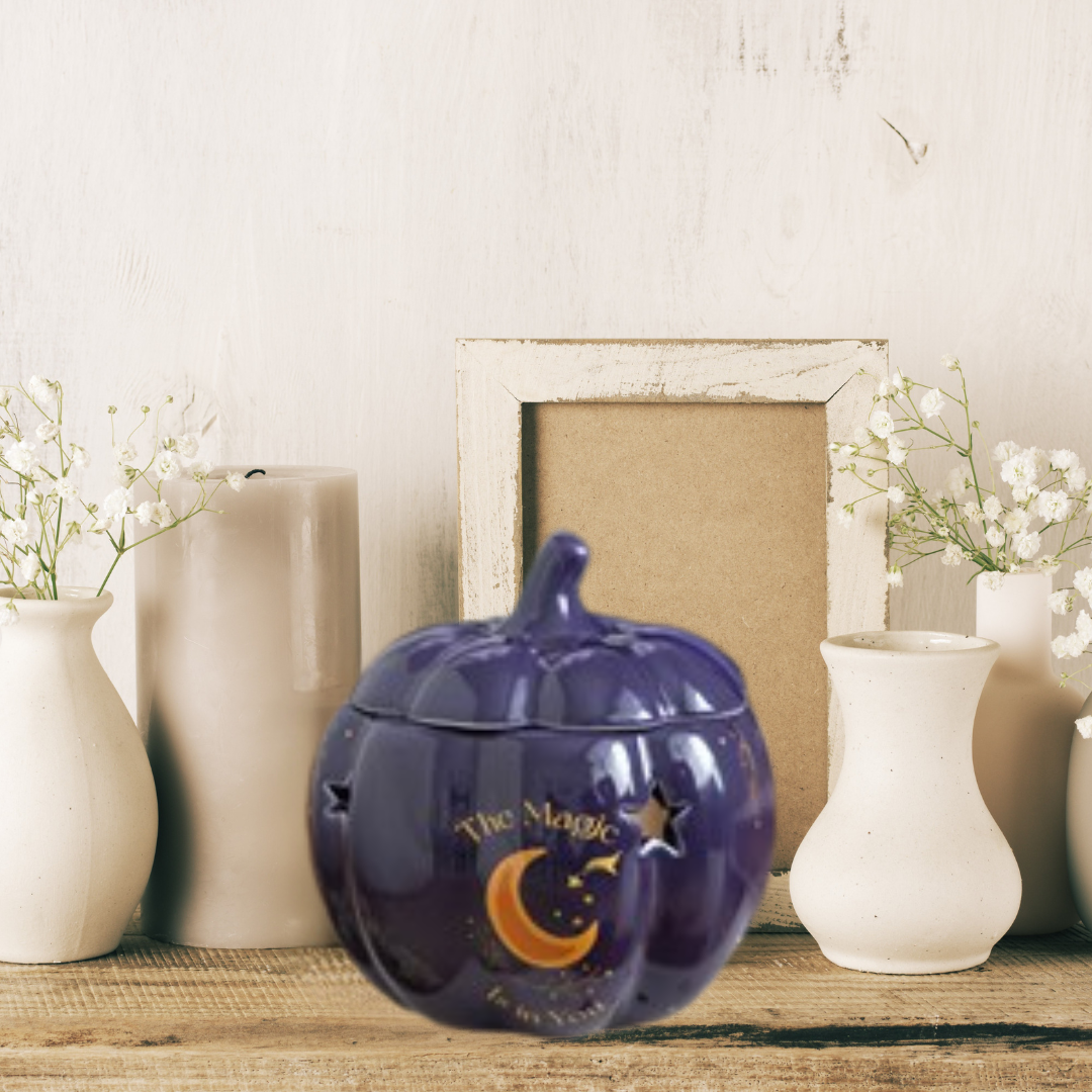 Créez une ambiance chaleureuse avec un élégant brûle-parfum en forme de citrouille mauve.