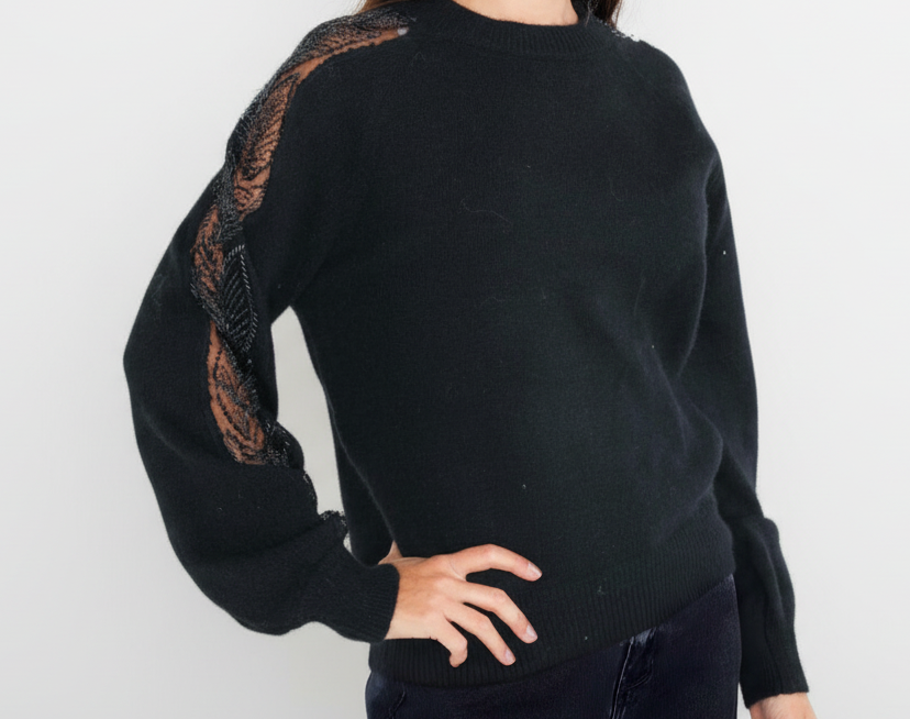 Pull avec manches transparentes perlées et strass.